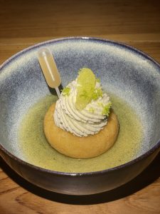 Pâte à baba, sirop de rhum, crème fouettée citron vert, suprêmes de citron vert, rhum arrangé maison